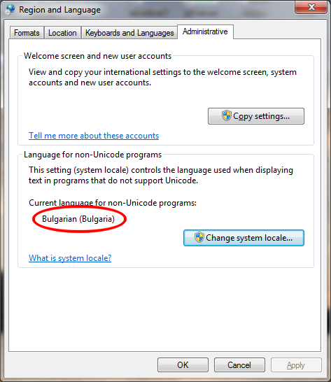Region and Language -> Administrative -> там имаше нещо от рода на change system Location би трябвало да е на български.